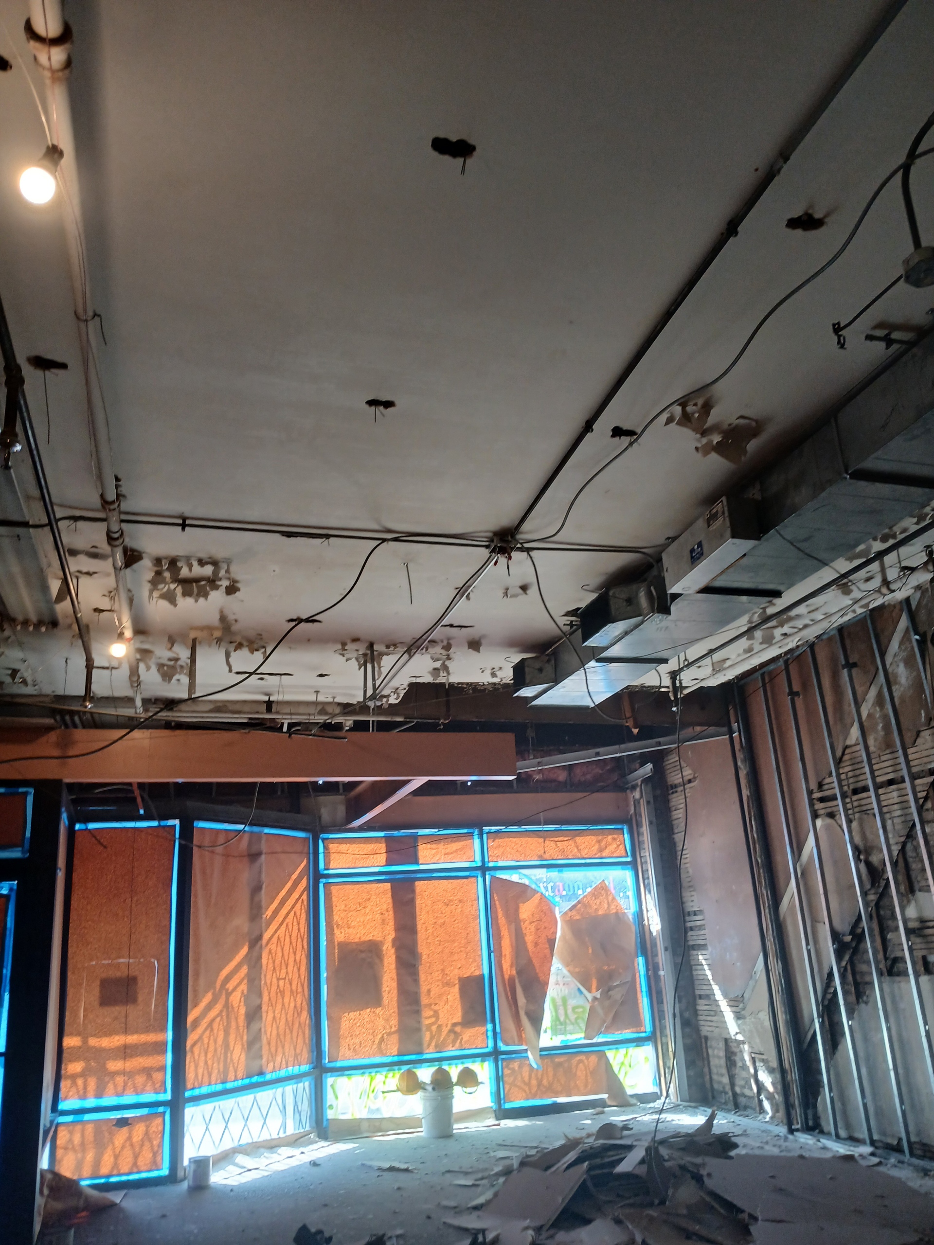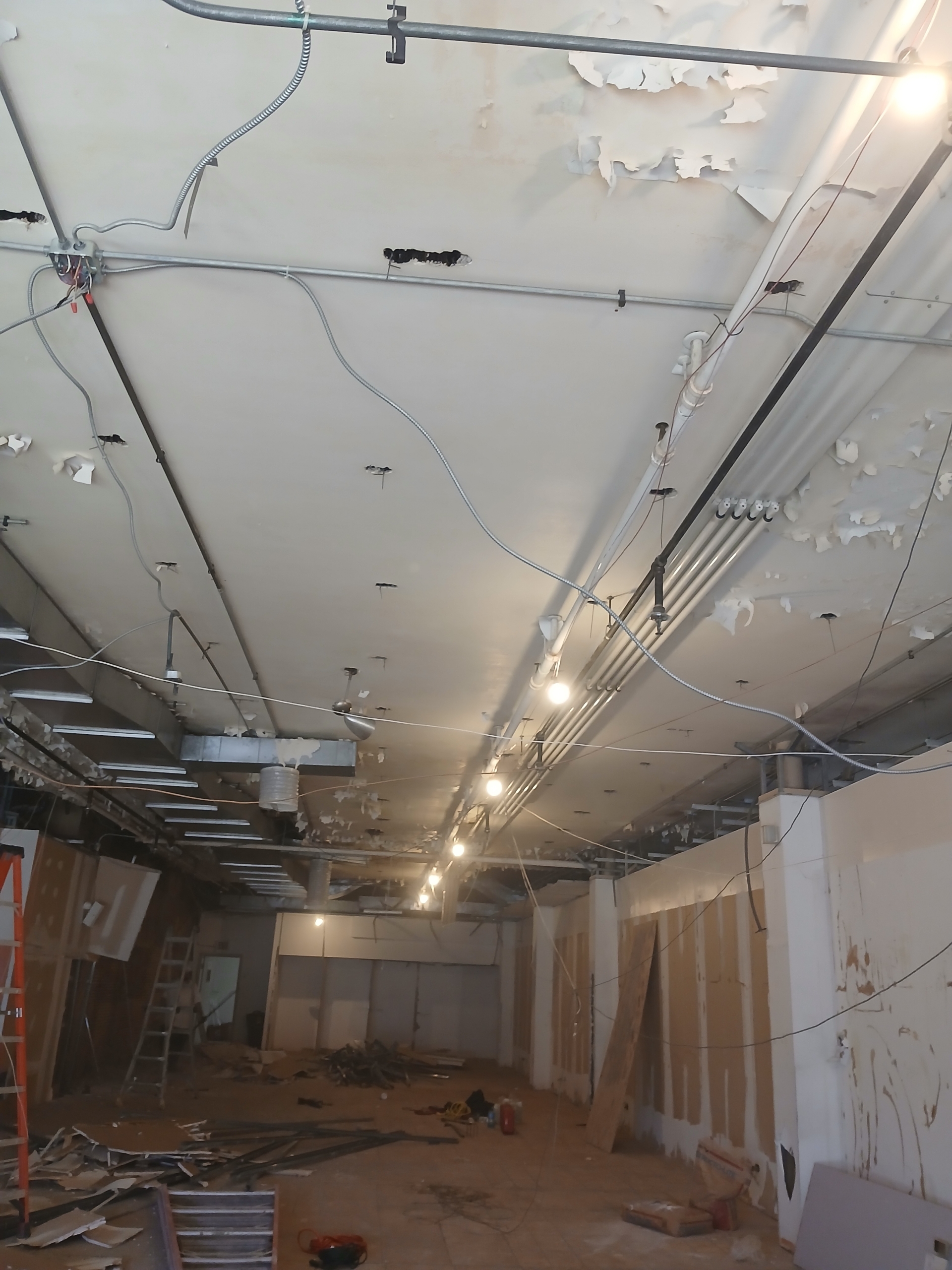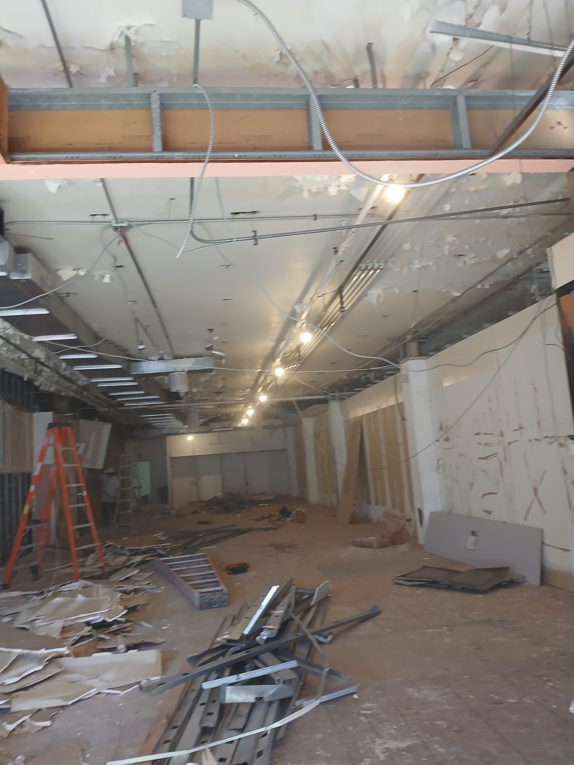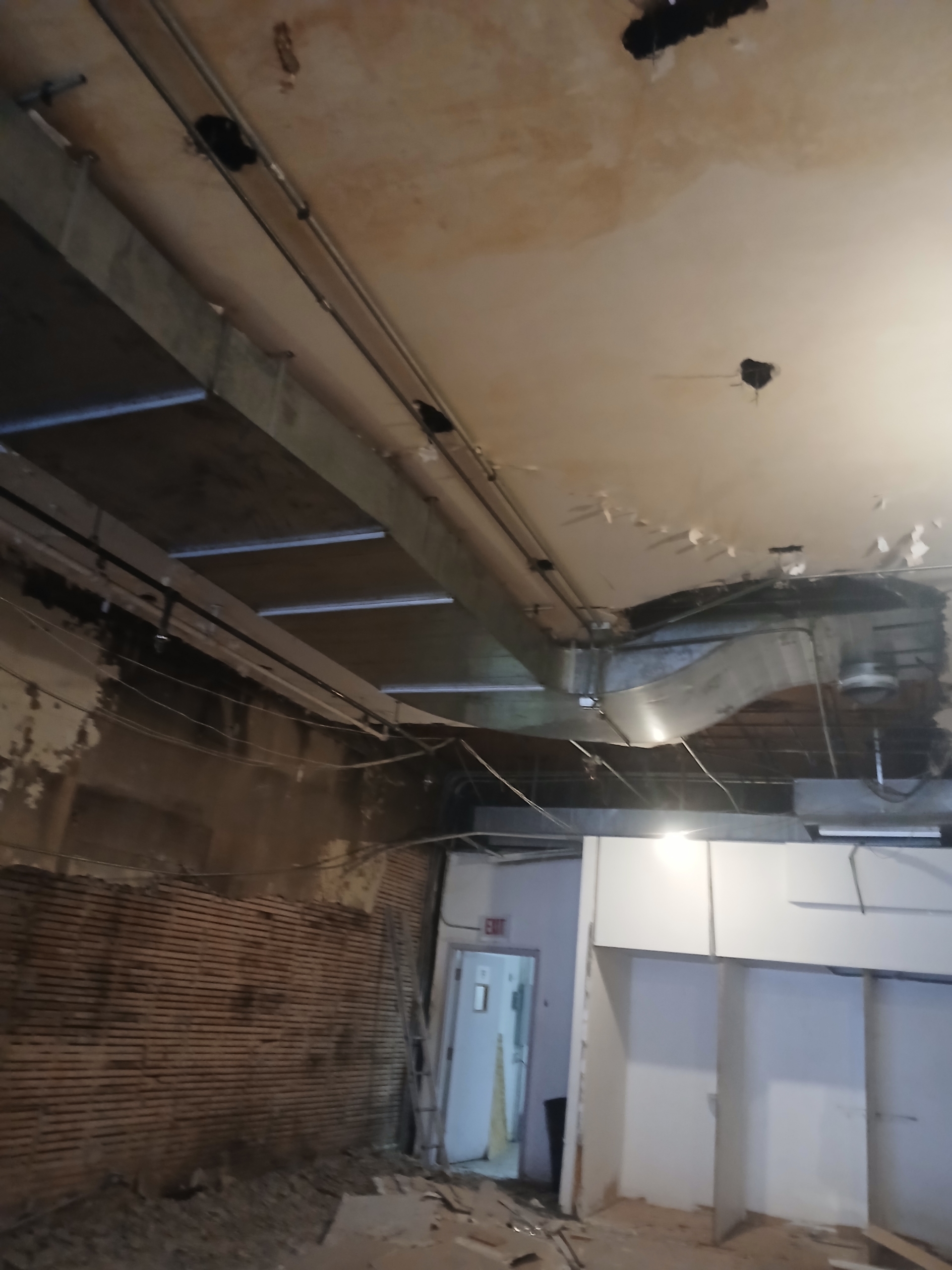 Ongoing demolition removing walls, ceiling, and interior structures.